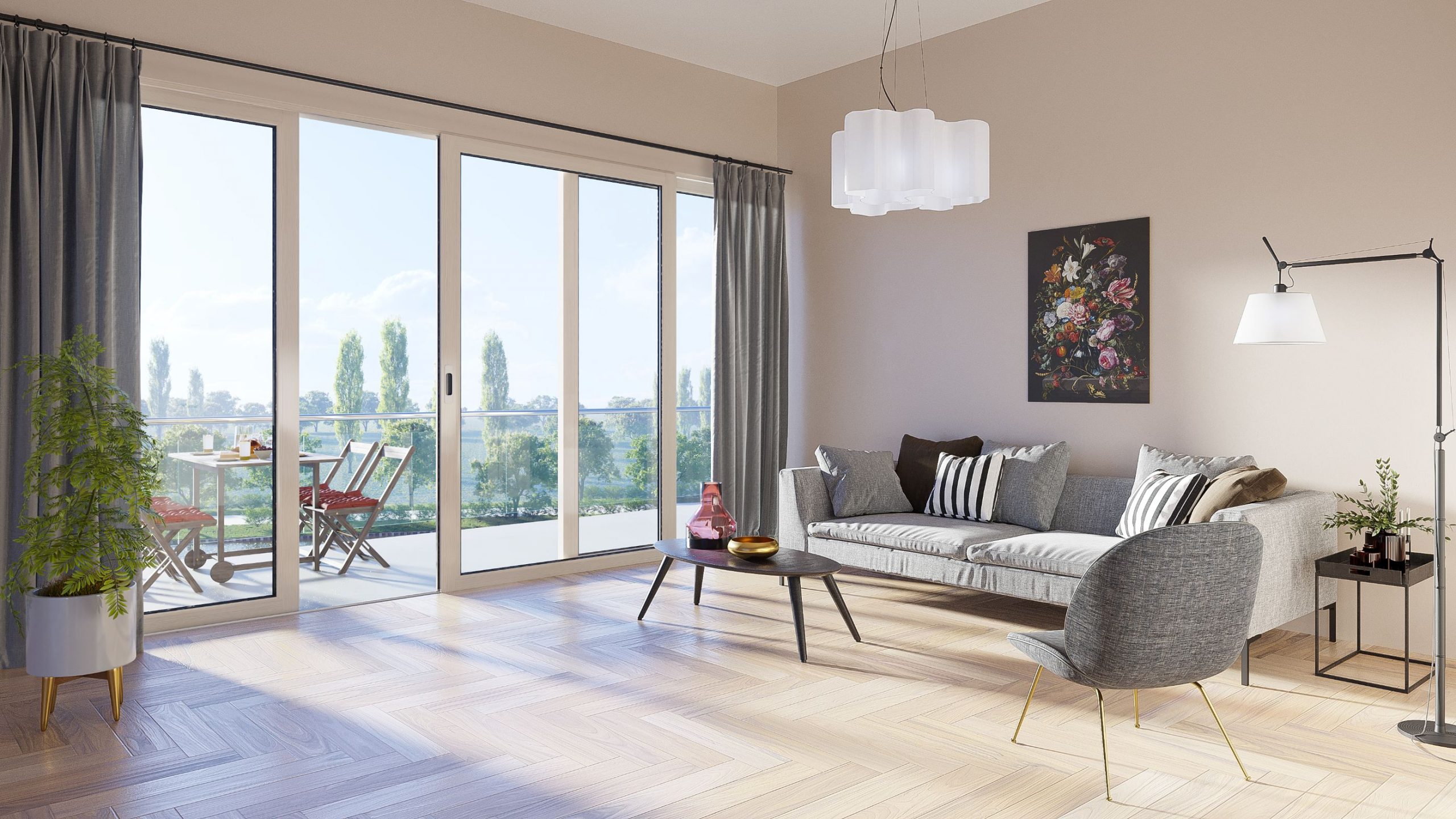 Alle appartementen zijn op het zuiden én in de breedte georiënteerd. Door dit ontwerp van Centrum Architecten profiteren alle appartementen maximaal van de zonnige ligging en de buitengewone hoeveelheid lichtinval. Elk appartement heeft een zeer royaal balkon over de volle breedte van de woning en daarmee een buitenruimte van 19 m2 of meer. Door de grote raampartijen geniet je van vanuit je woonkamer én beide slaapkamers van weidse uitzichten over groen en water.